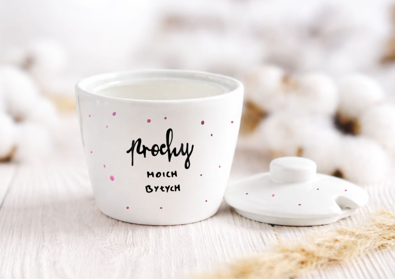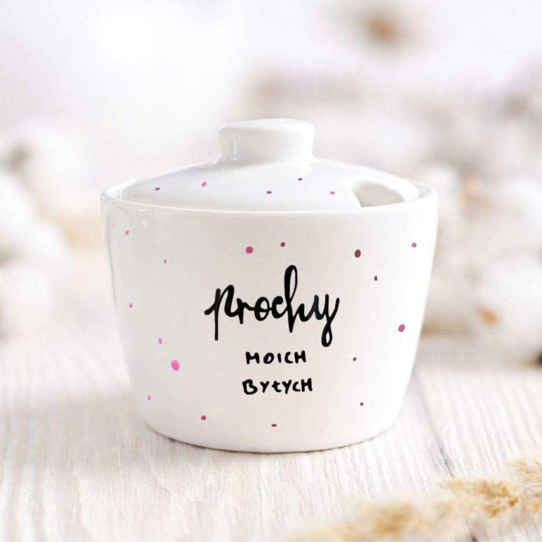 Dodatkowa personalizacja : Na ściance cukiernicy, po przeciwnej stronie rysunku, możemy dopisać dowolny krótki tekst (do 6 słów) – jeśli chcesz skorzystać z tej opcji dodaj do koszyka produkt PERSONALIZACJA KUBKA.